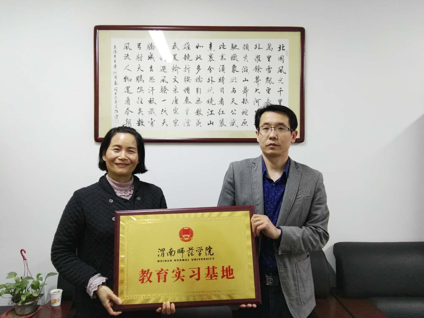 在渭南育红小学,朱芳转代表公司和该校签订了共建实习基地协议书,并举行了实习基地挂牌仪式。