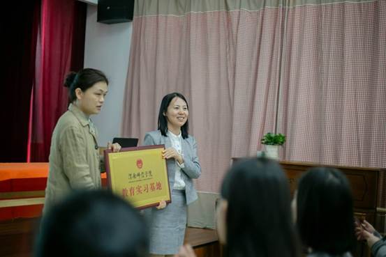 子悦优家幼儿园,园门是一个大象的造型,园所建筑采用原木,颜色简单,风格简朴,设计让人耳目一新,室内布置梵高向日葵名画,寓意温暖,阳光,积极向上,园里有小朋友亲手种植的花草植物及水果蔬菜。我们去时恰逢幼儿园用餐时间,室内的空气里弥漫着饭香,小朋友们围着桌子吃的很开心。曹园长带着大家参观并进行详细介绍,特别推介了我们学姐在幼儿园的优异表现,提出很期待我们去园里实习工作,交流学习。现场举行了实习基地签约和挂牌仪式。