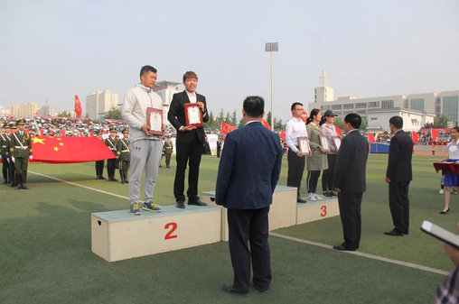 校领导为在校运会上取得优异成绩的公司代表颁奖,全场掌声不断,喝彩声连绵不绝。