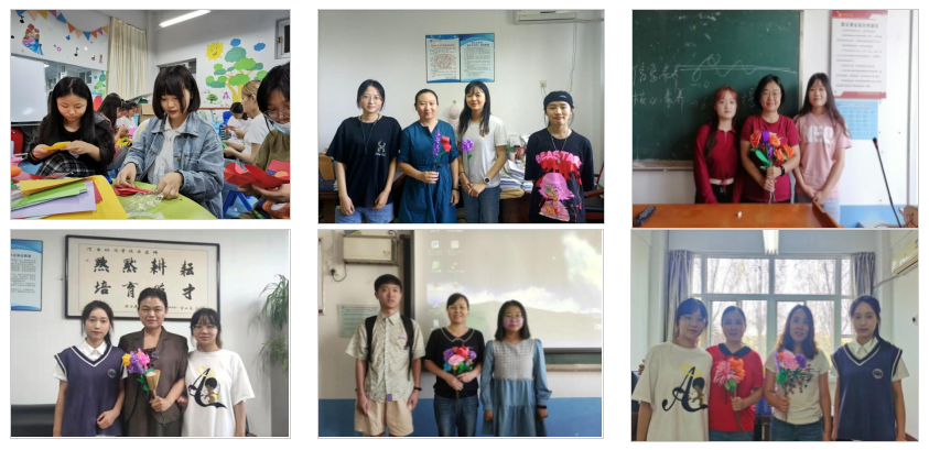 送上花朵献祝福。教师节当天,学前专业委员会会长闵玉婕、杨紫涵等同学为教科院老师们献上由学前学子们手工制作的花朵。老师们收到这份惊喜时,脸上洋溢着喜悦的表情,纷纷与同学们拍照留念,将这一温馨美好的时刻定格成永恒。