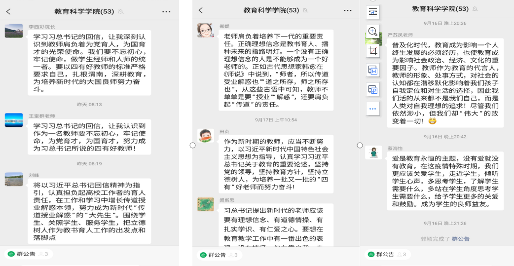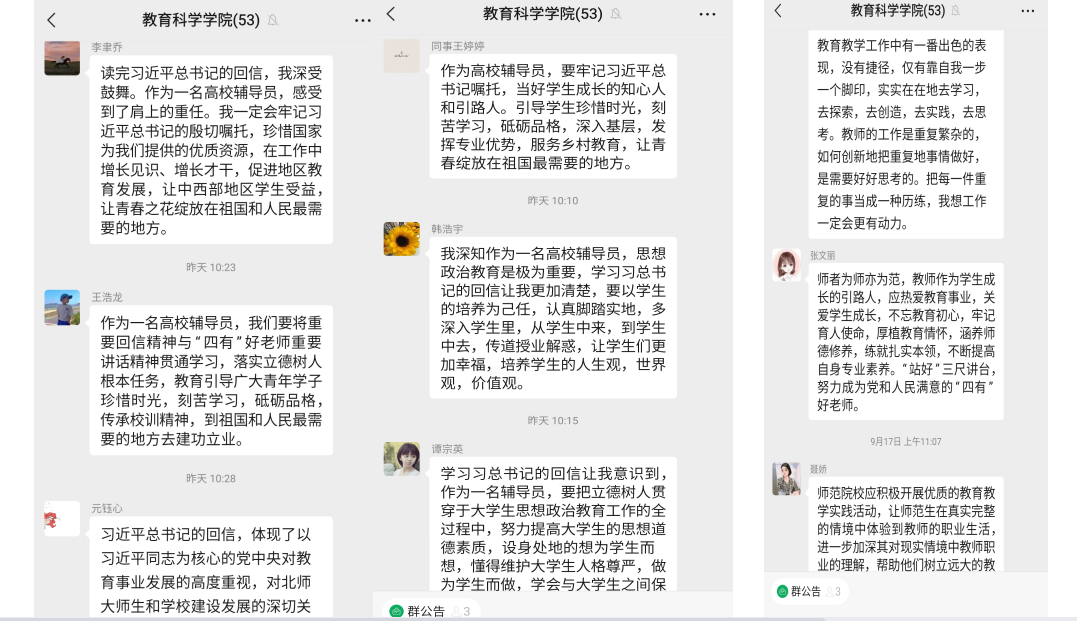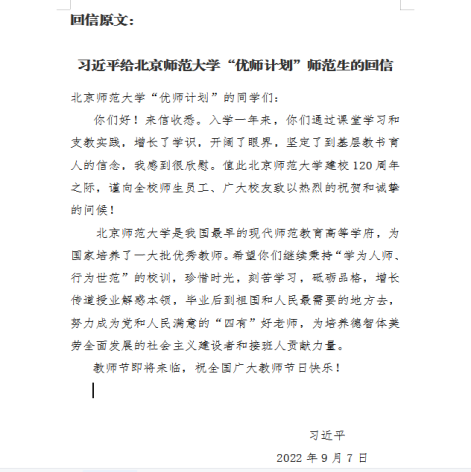 中共中央总书记、国家主席、中央军委主席习近平9月7日给北京师范公司“优师计划”师范生回信,对他们寄予殷切厚望,并在北师大建校120周年和第38个教师节来临之际,向该校师生员工、广大员工表示祝贺和问候,向全国广大教师致以节日的祝福。为全面贯彻落实习近平总书记回信中的重要思想,9月16日-9月18日,英国365集团官网组织全体教职工在线学习习近平总书记给北京师范大学“优师计划”师范生回信的内容,并对信中精神认真领悟和热议。