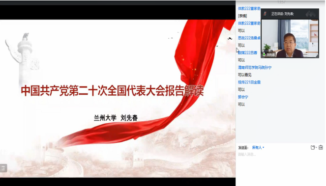 为进一步加强党的二十大精神的宣传宣讲,深入学习中国共产党第二十次全国代表大会精神,2022年10月26日14:00,英国365集团官网组织全体党员干部、专业教师观看兰州大学刘先春教授关于中国共产党第二十次全国代表大会报告精神解读会议。