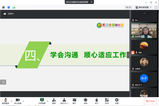 为切实帮助师范生做好职业生涯规划,探究自身成长路径,制定可行的行动方案,早日成为智慧型幼儿教师,2022年11月10日晚,公司特邀陕西省教学能手、苏园丰景幼儿园园长李杜娟作题为《科学规划人生成就美好未来》的报告。报告通过腾讯会议平台在线开展,学前教育专业师生共150余人聆听了报告,会议由副经理杨方琦主持。