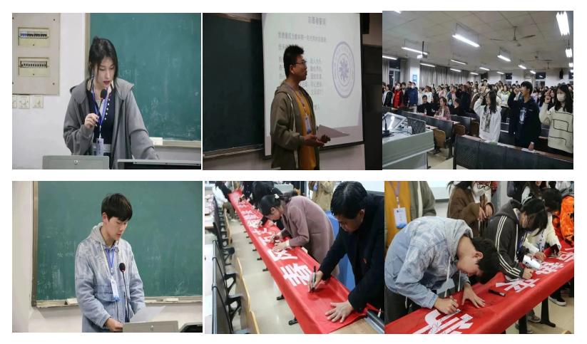 “鸣远”志愿者协会代表袁清洋同学为大家讲解了协会名“一鸣惊人、登高望远、积极进取、脚踏实地”的含义,同时讲解了协会徽标含义以及协会未来发展规划。王嘉琪同学带领全体与会员工进行了宣誓。随后,由郝毅航同学代表公司向全体师生发出“学雷锋”倡议,号召老师和同学们从身边的小事做起,共同携手,积极参与“学雷锋”志愿服务活动。最后,全体与会师生在“春风万丈惊蛰来,学习雷锋好榜样”横幅上郑重签名。