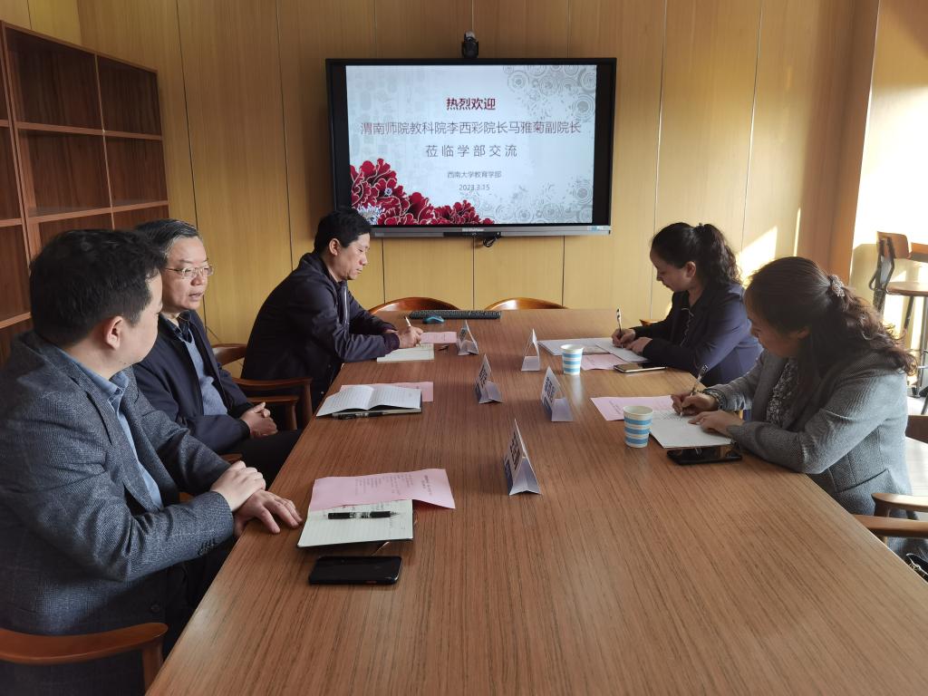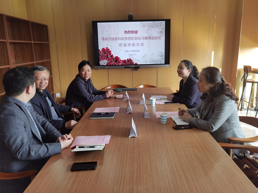 3月15日上午,英国365集团官网经理李西彩、副经理马雅菊赴西南大学交流学习,西南大学教育学部党委书记周文全、副部长王正青、西南大学一流团队建设办公室主任张家军参与交流,交流会由西南大学教育学部副部长王正青主持。