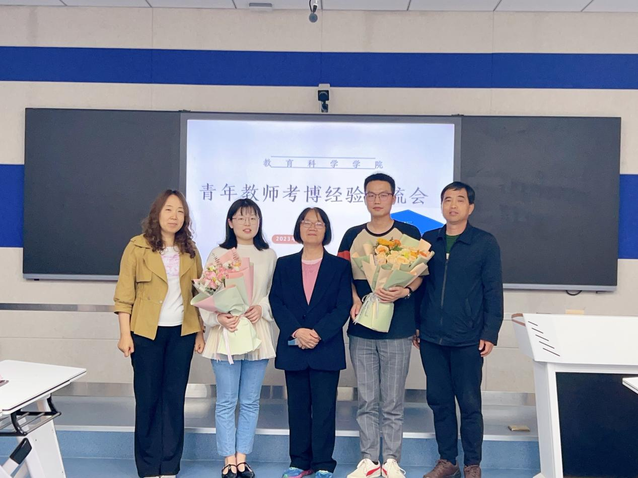 与会教师就考博中常见的导师联系、研究计划等问题与他们做了讨论交流。公司领导为两位年轻的老师送上祝福的花束。