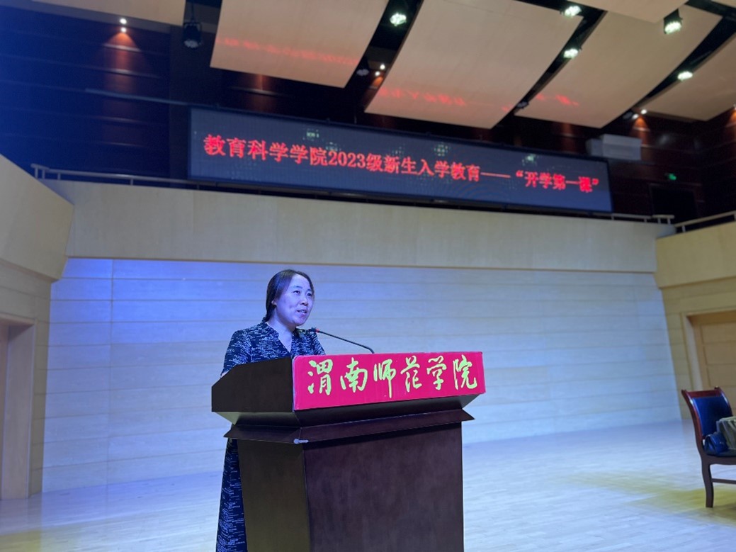 郗莉董事长以“教师是立教之本、兴教之源”为切入点,结合自身教育和成长经历,从“选择与认知、行动与路径、发展与规划”三部分出发,阐述了她在教育事业中坚守初心、扎根教育实践的故事。她鼓励新生,作为一名师范学子,在未来生活学习中要始终坚持选择教育事业的初心,用初心对待自己的教育工作,用脚踏实地和勤奋努力实现自己的教育目标,不断深耕教育之花,争做有理想、敢担当、能吃苦、肯奋斗的新时代四有好老师。