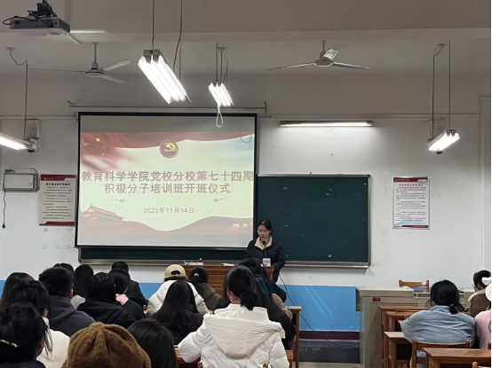 开班仪式上,李旭君主要介绍了本次培训班的课程安排和相关要求。她在会议中强调了本次培训的学习纪律和学习方式,要求各位积极分子能自觉主动地接受党组织的培养和教育,认真领会积极分子培训的深刻意义,不断端正入党动机,加强党性修养,在思想上、行动上主动向党组织靠拢。