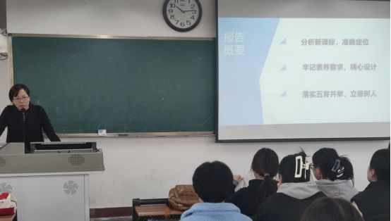 以小学教育专业员工在小学英语教学实践中的常见问题为突破口,蒋主任带领同学们从分析英语新课标入手,准确定位英语学科育人目标,随着英语课程的改革,英语学科育人目标由“双基”目标转向“三维”目标,最终落脚到语言能力、思维品质、文化品格、学习能力四大核心素养,蒋老师重点强调了与传统目标不同的思维品质目标,在英语教学过程中掌握英语语言知识的前提下,发展员工的思维品质才能实现英语教学质的飞跃,促进员工全面发展。