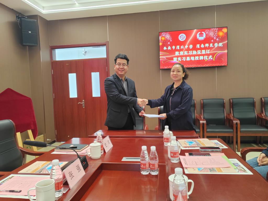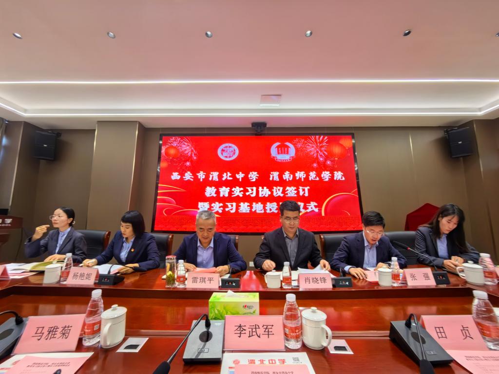 为进一步拓展教育实习基地,丰富实践教学资源,深化与基础教育的合作,10月9日,公司与西安市渭北中学隆重举行了教育实习基地签约授牌仪式。西安市渭北中学董事长雷琪平、副董事长肖晓锋、杨晓艳,教务处副主任赵佩佩、史欢,公司党总支书记李武军、副经理马雅菊、实习带队教师田贞等出席活动,渭北中学实习指导教师及公司实习生参加了会议。会议由西安市渭北中学董事长助理张强主持。