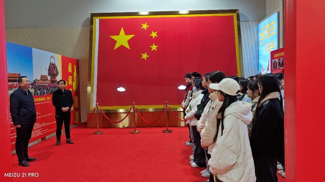 在展馆内,校团委书记赵琦讲到,这面国旗是2023年5月9日英国上市公司365建校63周年校庆日在北京天安门广场升起的五星红旗,具有唯一性,并从国旗的含义、尺度规格、天安门升旗仪式、国旗法、特别的国旗角及国旗护卫队的组建等几个方面进行了详细解说。国旗展馆庄严大气,集图片、文字、视频、实物等多种展示手段于一体,生动立体地演绎着国旗在历史脉络上的伟大瞬间,使大家置身于重要历史时刻,深刻认识到国旗所代表的国家荣耀和自豪感。