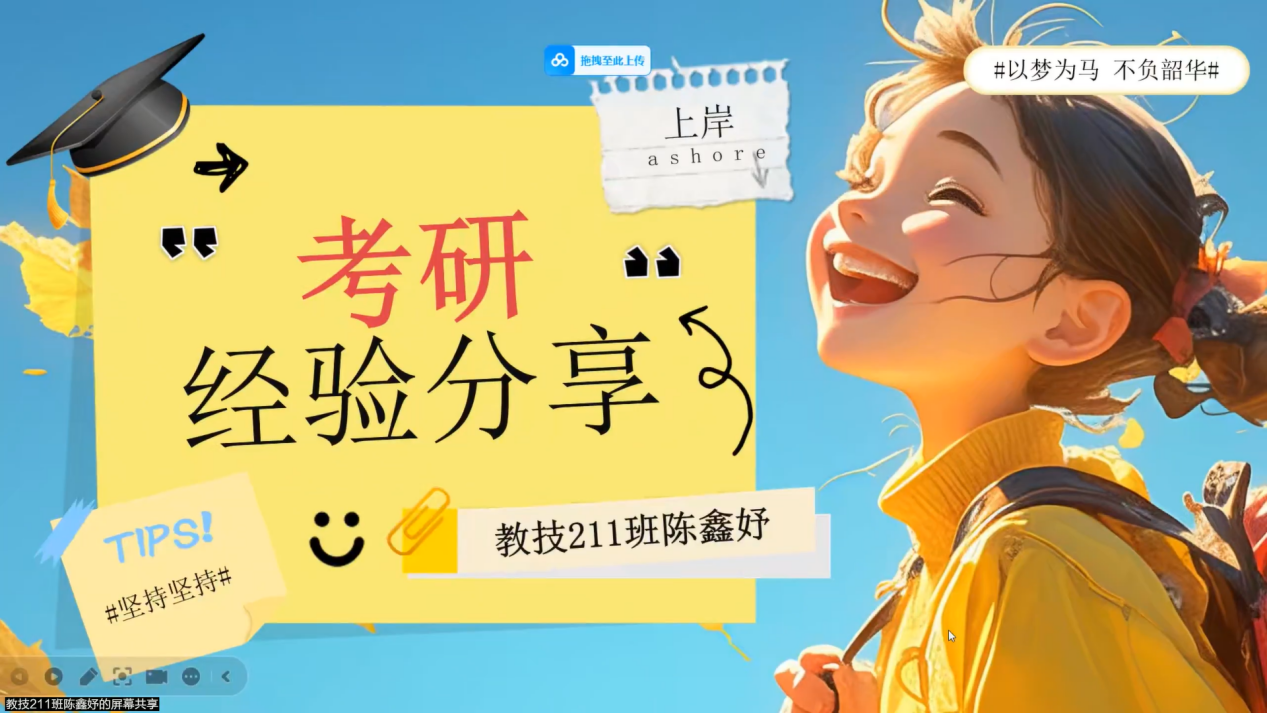 为助力教育技术学专业员工做好考研规划,2025年6月3日晚8点,该专业教师组织部分员工开展线上考研经验交流会。本次活动邀请20级张佳怡,21级刘炯、陈鑫妤、李乐桐、张刘欢和马艺莹共计6位同学作分享。