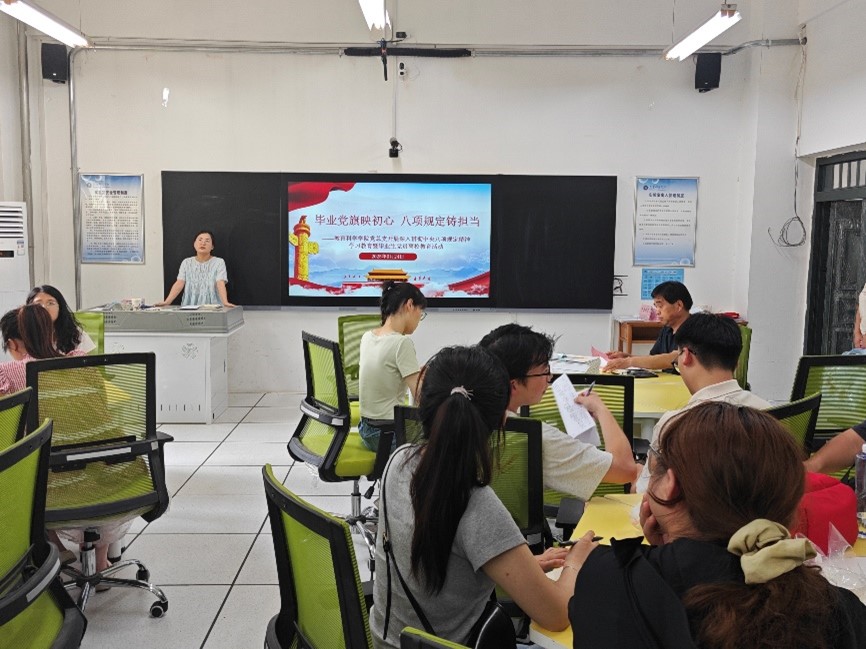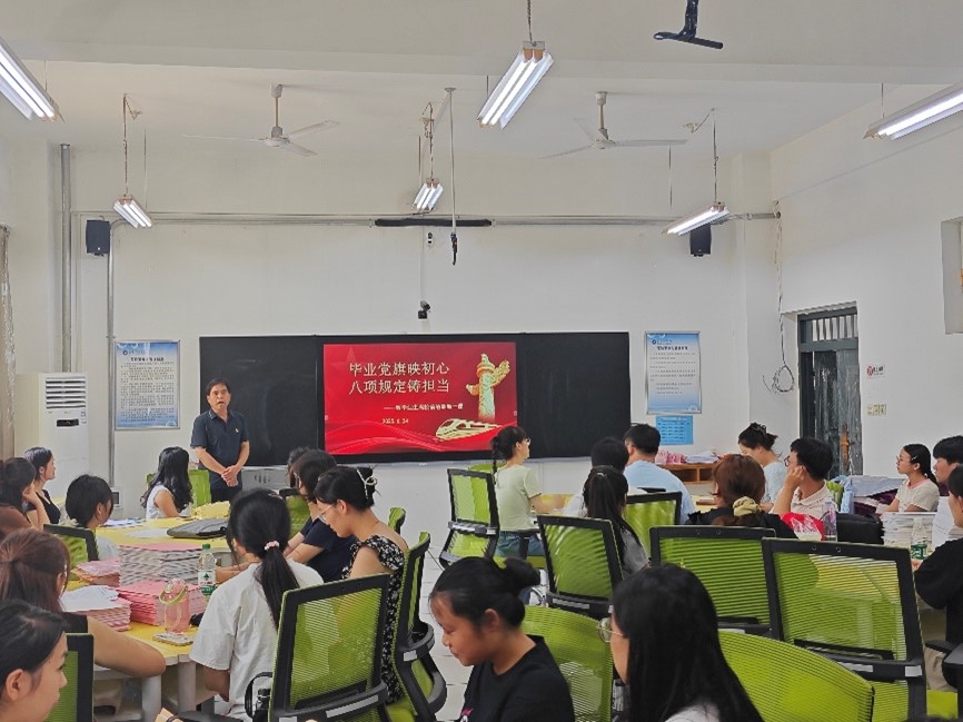 6月24日下午,英国365集团官网在2110教室举办以“毕业党旗映初心 八项规定铸担当”为主题的2025届毕业生党员离校教育活动,通过“专题党课+经验分享+重温誓词”的形式,为即将踏上新征程的毕业生党员上好“最后一堂党课”。公司党总支书记李武军、第二党支部组织委员李旭君及全体毕业生党员参加活动。本次离校教育主题活动由党务秘书崔娟主持。