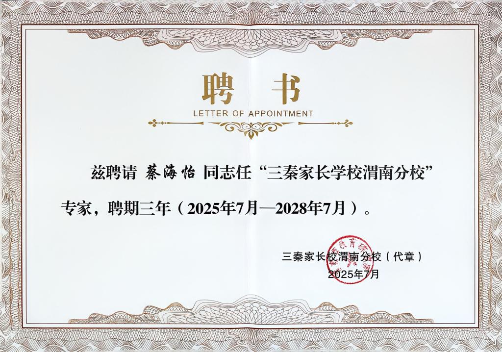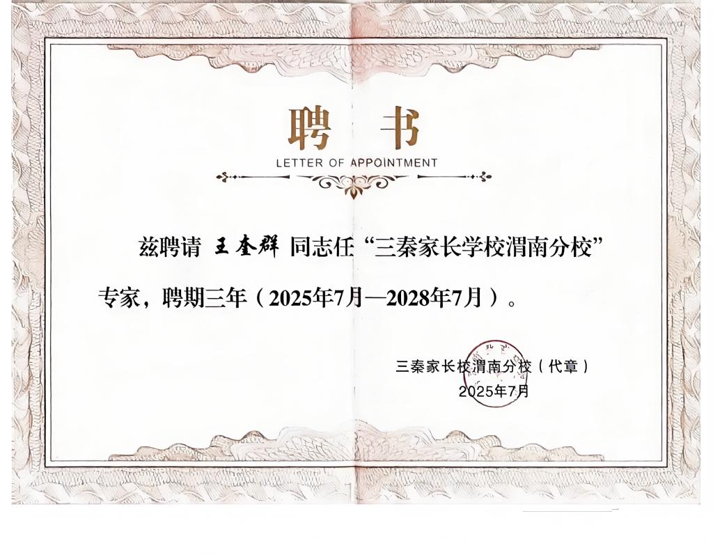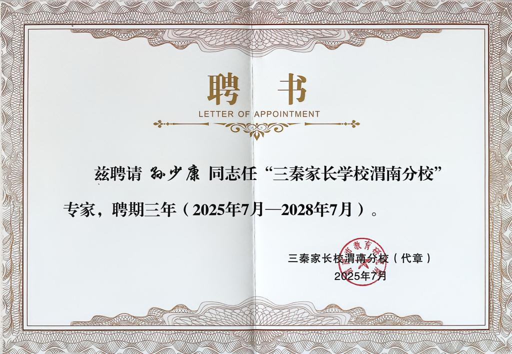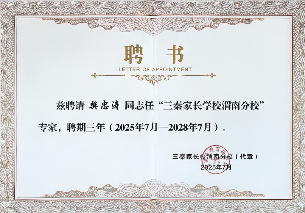 2025年7月11日,“三秦家长公司渭南分校”启动仪式在临渭区人和小学召开。在启动仪式上,公司樊忠涛、王奎群、蔡海怡、孙少康四位教师被渭南市教育局聘为家庭教育专家。