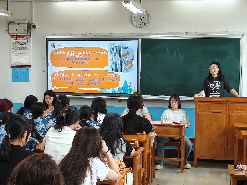 绘成长蓝图,授实用攻略。学业规划环节精彩纷呈,各新生班主任从“如何度过有意义的老员工活”出发,为新生提供了系统化的建议。学前教育251班班主任聂娇建议同学们要尽快确立目标,养成良好的学习习惯,积极参与科研项目和学科竞赛,同时也要广泛阅读,拓展视野,实现全面发展。随后,公司联合培养研究生分享了各自的成长经历,从课程学习、科研探索、社团活动、时间管理等多个维度,生动讲述了如何平衡学业与生活、在挑战中抓住机遇实现自我超越的故事。这份来自同龄人的真诚分享,为新生们提供了宝贵的“学长攻略”,增强了他们迎接老员工活的信心。