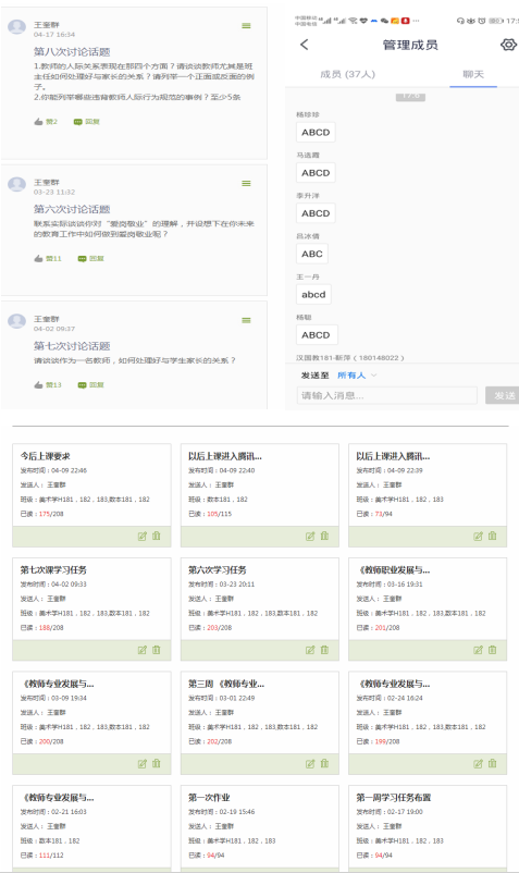 为了沟通方便,我利用QQ群为团队教师搭建了一个交流沟通的平台。根据公司要求,我把这门课的教学计划发到群里,让团队教师明确每次课程的教学内容,做到了教学进度基本统一。由于我们要讲的教材和中国大学慕课平台龙宝新老师的《教师专业发展与职业道德》内容完全一致,我就把龙宝新老师的课程作为团队教学、员工学习的一个重要资源。每次组织员工上课前,我们团队每个成员首先自己认真学习龙老师的课,非常清楚每次课所学内容的重点、难点。然后,我们龙老师所讲内容精心设计的练习题和讨论题,以达到了员工对所学知识的检测和巩固。员工在学习中有疑问,我们通过qq群或微信群给与解答。下面是团队教师创建课程及教学中相互沟通的图片。