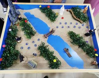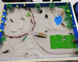 沙盘游戏实验室共有三套沙盘,每套的基本配置包括两个沙箱(一个干沙,一个湿沙)和约1600种沙具,沙具具体包括人物、动物、植物、建筑物、交通工具、家具设备、生活用品、抽象图形(如三角、五星、球体等)、自然界物件如石子以及各种象征符号等。来访者从中选择自己需要的沙具在沙箱中摆放,从而充分展现自己的内在世界,表达自己的情感体验,并从中获得对自身心灵的知性理解和情感关怀。