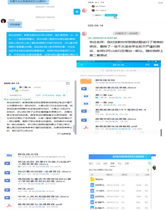公司承担着公司8门教师教育类公共课,设计全校三个年级,上至公司领导,下至代课教师,大家都发挥自己的优势资源,提供在线教学的各种资源,同时成立的公共课主讲教师,每个教师负责每门课程的教授进度,资源共享,同时鼓励大家在集体布置任务的同时,开展网络在线自主学习加教师直播授课,利用各种软件与工具与员工建立沟通。及时与相关出版社联系将教材电子版发布给员工,同时利用超星网络资源,推荐有电子书目的辅助教材。公共课我承担着教育学基础4个班的教学,政策法规我承担着17班的教学任务,同时兼任两门专业课。我主讲教育政策法规课程,除了选择学堂在线同门课程让员工自学之外,我们还收集了相关案例,利用疫情期间出现的各种违法事件,引发员工反思讨论。同时针对教学实际和学科严谨性,对网络上的教学资源进行了筛选和修正。及时发布给任课教师。在开展直播以后,要求教师针对前面所学内容专门进行一次串讲,以达到知识的巩固性。做到前后有衔接。。