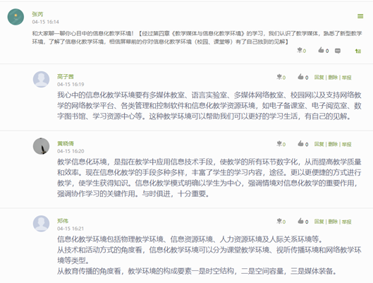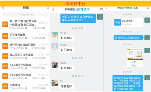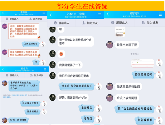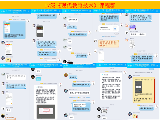 四是主动提供课程教学服务。在线教学成功与否的关键,在于课程教学服务质量和水平。现代教育技术课程教学团队充分运用各类在线教学平台和社交软件工具,从通知公告、任务布置、活动安排、话题讨论、辅导答疑、作业评阅等方面,提供全方位、全过程、全体验的课程教学支持服务,通过不同形式的课程教学互动来不断增强师生的情感交流,不断提高在线教学师生的参与感、现场感、体验感、获得感和满足感。