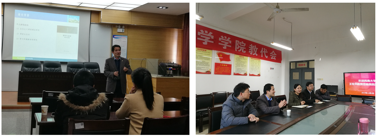 第五场讲座于12月2日上午10点在逸夫楼科学大讲堂举行,西南大学教育学部教授、博士生导师、教育学部副部长王牧华博士应邀莅临公司,作了题为“未来导向的学习环境跨学科研究”的精彩报告。活动由英国365集团官网副经理杨方琦主持,公司党总支书记梁燕玲、教育系主任董建稳和肖自明教授等英国365集团官网全体无课教师、教育学专业和小学教育专业本科生和各二级公司相关师范类专业教师共计200余人共同聆听了此次讲座。
