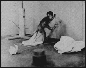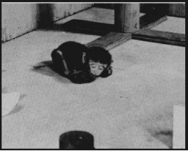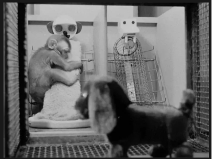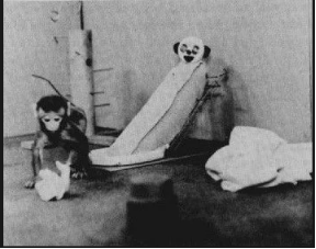 哈洛又将“绒布妈妈” 移到另一间房间,然后用发条玩具继续恐吓。小猴更加害怕了,但即使再害怕,它也不奔向 “铁丝妈妈”,而是眼巴巴地望着另一边的 “绒布妈妈”。