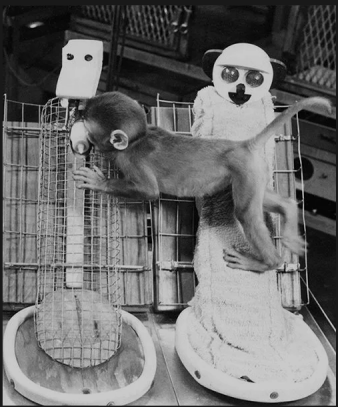 哈洛把刚出生婴猴放进笼中,然后用两个假猴子代替母猴。