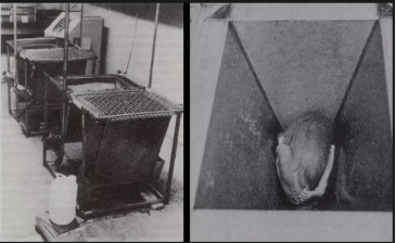 最后,哈洛做了一个非常残忍的实验,这个实验叫——绝望之井。哈洛制造了一个个漏斗型小黑屋,让小猴们头部朝下吊了两年,底部有个容器可以获取食物。刚开始的时候,小猴会不断顺着峭壁往上爬,但发现无法逃离后,便孤独绝望地安静了下来。哈洛称之为 “绝望之井”。
